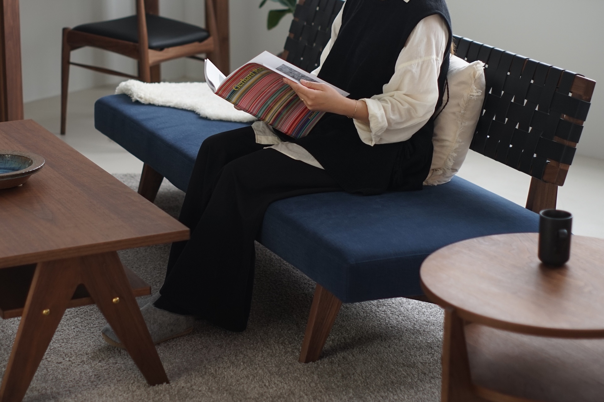 全体のスタイルはミッドセンチュリー・モダンの要素を取り入れており、シックで落ち着いた雰囲気を演出しています。木製のローテーブルやサイドテーブルと相性が良く、モダンな空間にも、ナチュラルな空間にも自然に溶け込むデザインです。
